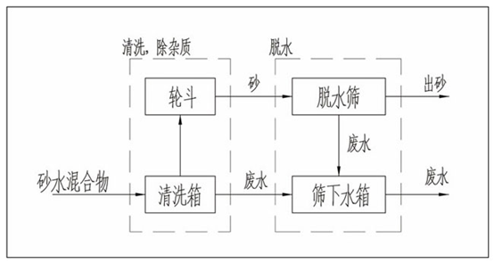 砂水混合物进入洗砂机清洗箱,经轮斗筛网过滤筛分,落入脱水筛做脱水处理,将沙子中的大量水分脱去。如下图: